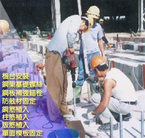 将前端削成45°尖角之钢筋或螺杆缓缓转入孔中,直到钢筋(螺杆)植入深度已足够到药剂稍许流出为止。